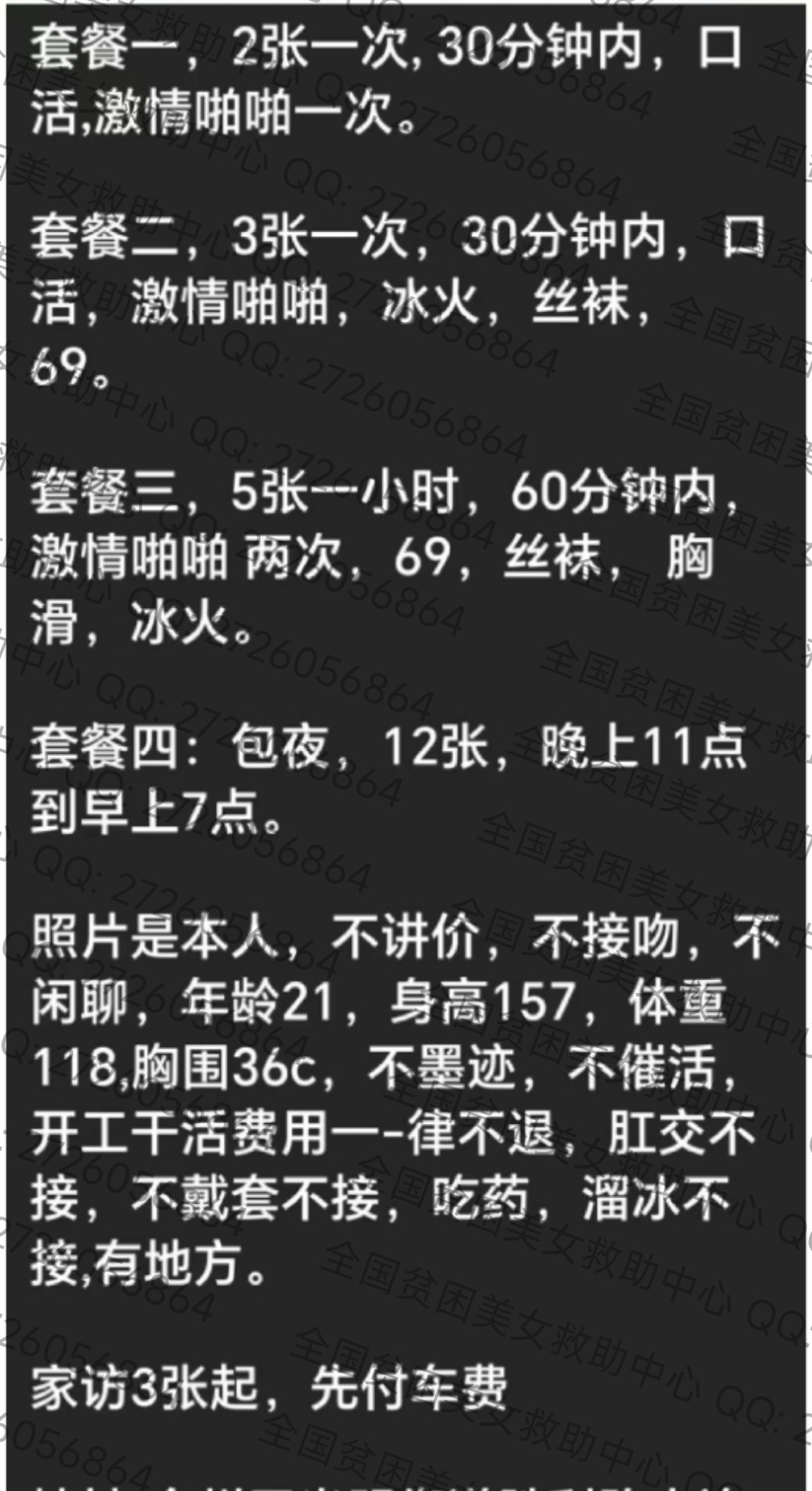 票价2张,操肛SM要加钱,真人和照片一致,目测40岁以上,很鸡巴带劲,身材大扎大屁股,全身散发着熟妇想被男人揉捏的气味,服务态度一流,不催人不死妈脸,洗吹做积极主动,逼和肛都很紧,可以玩捆绑虐阴之类,总结性价比无敌,四舍五入约等于免费,最近妹子遇到一点小困难,有善心人士去救助她吗?
