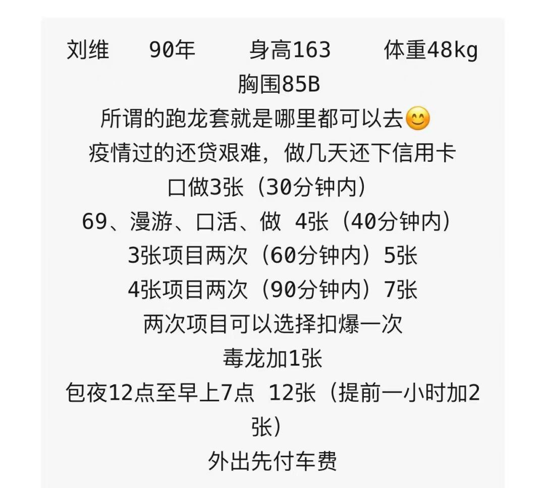 票价4张,这妹子是兼职,有正经工作,时间不太好约,颜值身材不错,没有露面照,服务态度不错,全程正常沟通不玩手机,总结来说4张这个价钱,不会亏,最近妹子遇到一点小困难,有善心人士去救助她吗?